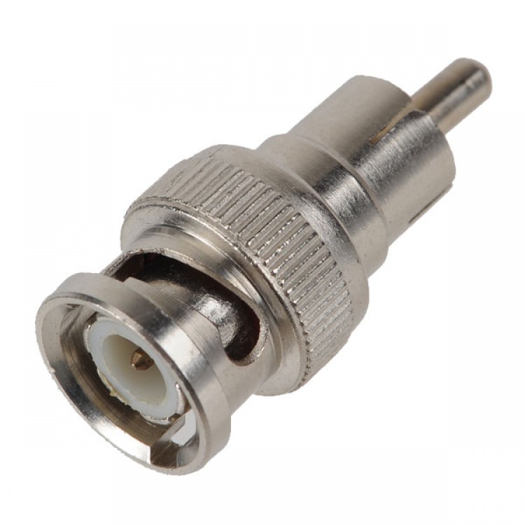 The Male BNC to Male RCA Connector from Mace is a connector designed to bridge different cable sections. It features a male BNC connector on one end and a male RCA connector on the other end.