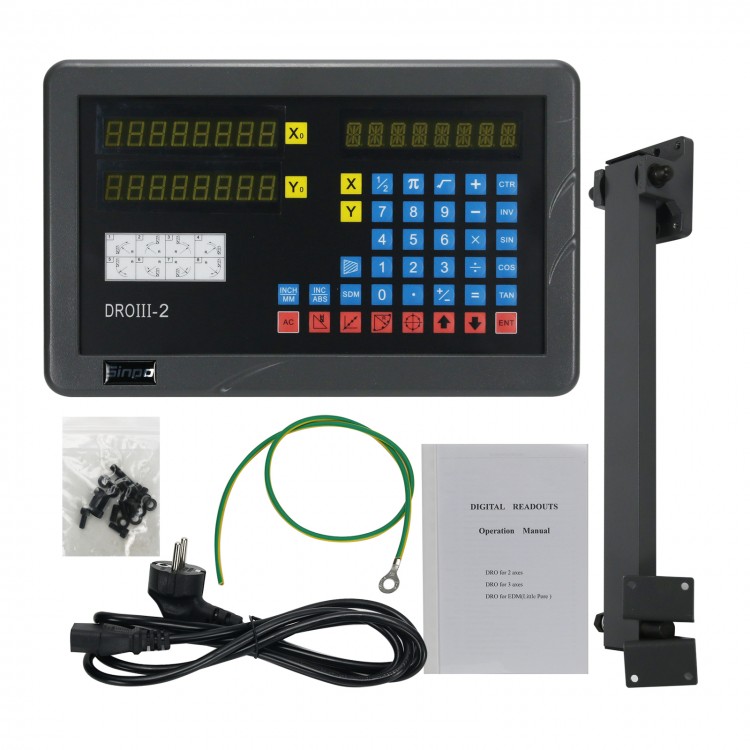 - Special function of milling DRO: Smooth ‘R’ Function; Simple ‘R’ Function; Bore in Oblique Line; Bore PCD Circle; Simple Calculator; Corner Chamfer Calculation; Inside Outside Profile Function.