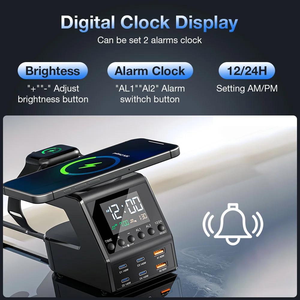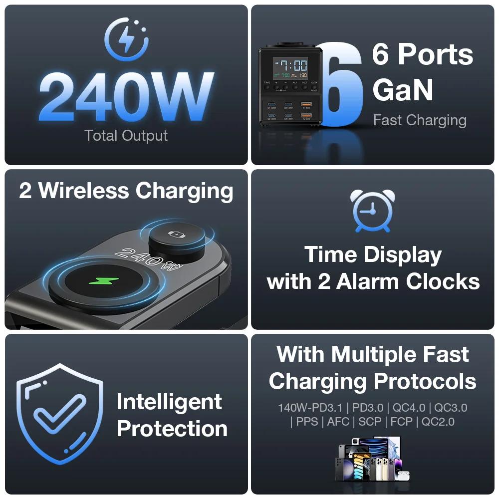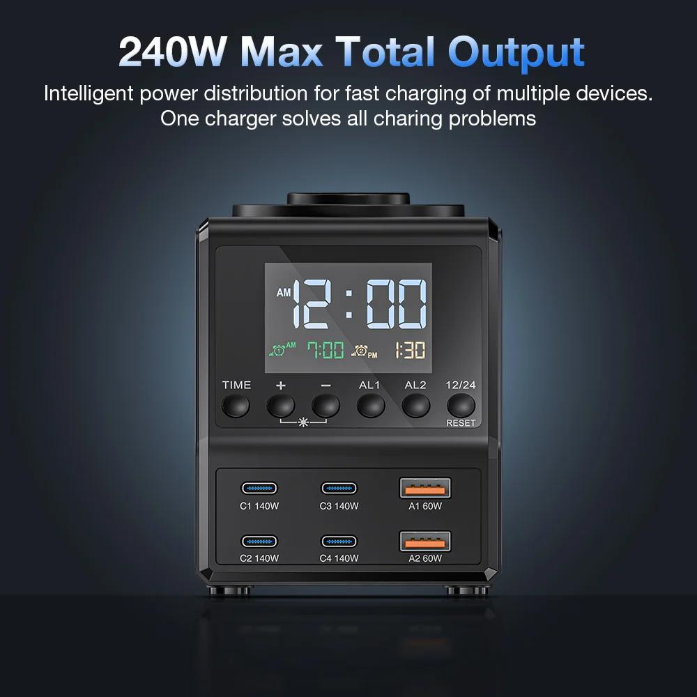 240W High Power Multifunctional Alarm Clock USB Type-C Wireless Charger QC3.0/PD3.0/PD3.1 Charging Station