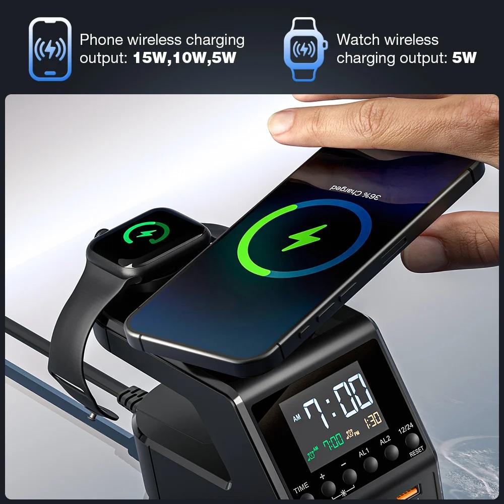 - Alarm clock + wireless charging for mobile phone + wireless charging for watch: 240W high-power desktop charger supports fast charging protocols such as QC3.0/PD3.0/PD3.1/PPS/SCP/AFC to adapt to various mobile phones, tablet PCs, and laptops, allowing your devices to quickly restore vitality!