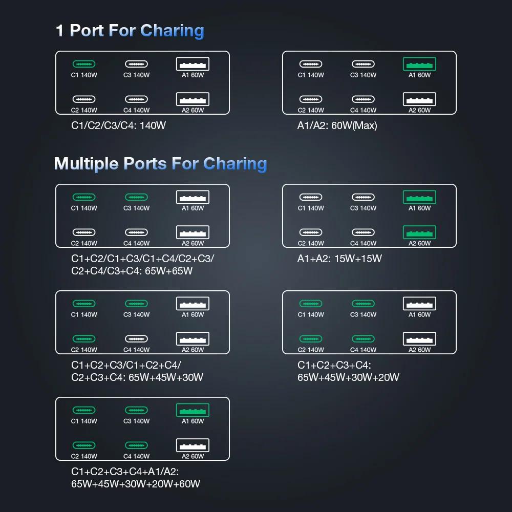 - Super compatible, suitable for various devices: mobile phones/tablets/laptops/game consoles + other digital devices. With this 240W charging device, you can meet various charging needs, including wireless charging for mobile phones, wireless charging for watches, Type-C x 4, and USB-A x 2.