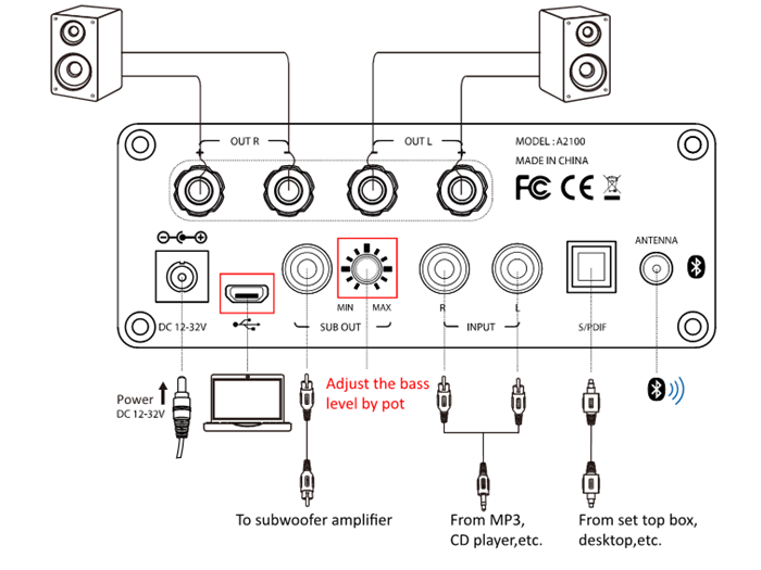 2x100W Bluetooth Audio Amplifier Class D + Mean Well 36V 160W Power Adapter + IR Remote Control
