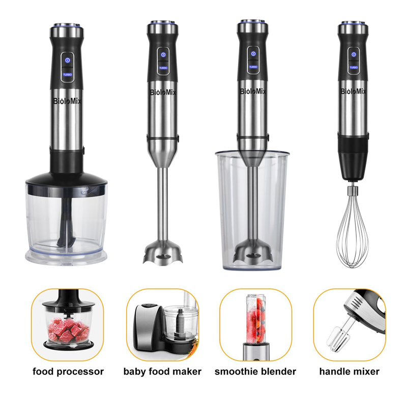 The Biolomix Hand Stick Blender was designed to blend, chop, whip, whisk, puree and emulsify depending on your cooking tasks with a stainless steel stick blender shaft and an S-shaped blade, a stainless steel whisk, a 500ml chopper bowl, and a 800 ml blending breaker.