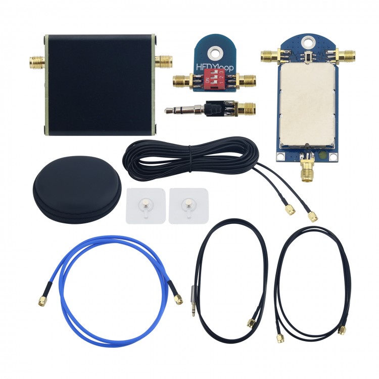 The small loop antenna consists of a small loop amplifier, a feeder and a top jumper board, two small loop coils (rg402 coaxial cable), one 5m/16.4ft feeder, one 1m/3.3ft feeder, one 12V linear power supply and 2 traceless adhesive hooks.