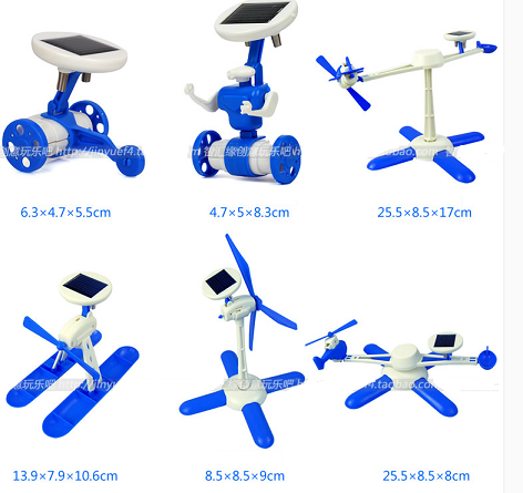 To own robot, wheeler, windmill, plane, helicopter and airboat, that's the great wish for all the children. To obtain them as long as tobe mild and environmental, that's the responsibility for all people in the world. Here it is the 6 in 1 solar kit.