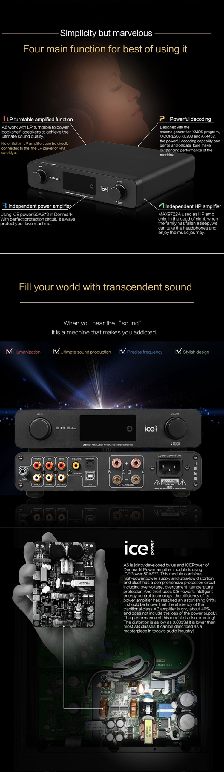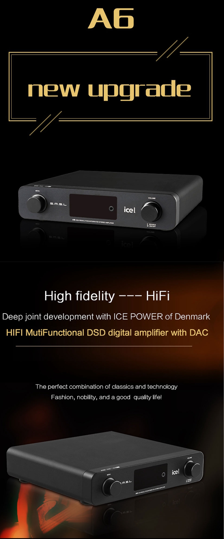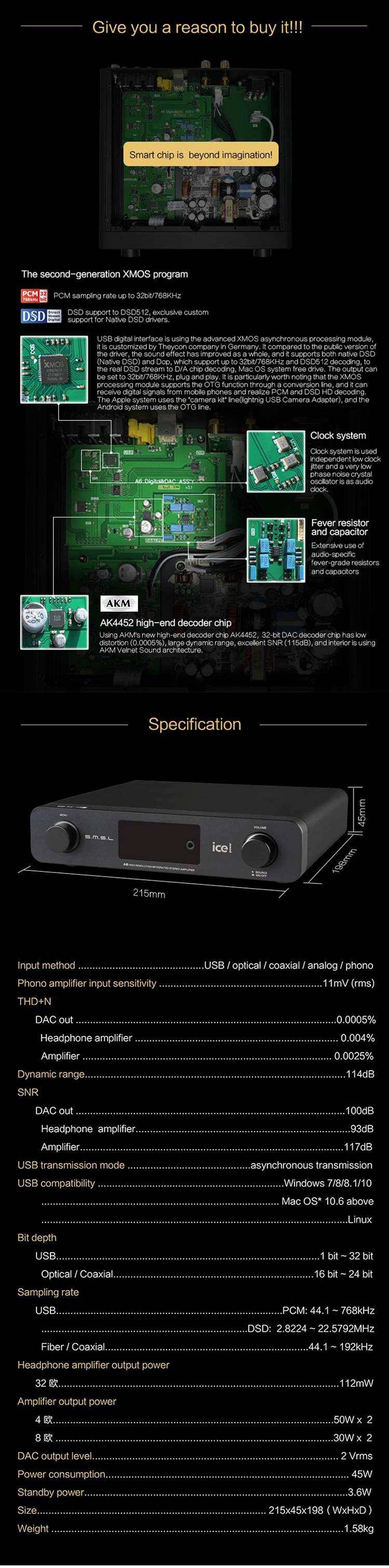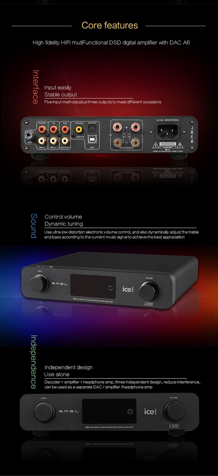 A6 Digital Amplifier USB DAC Audio Amp Hi-Fi Amplifier DAC DSD Amplifier Audio Decoder AK4452