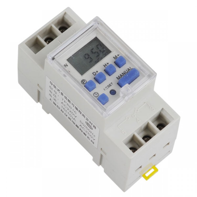 This programmable timer features LED indicator, can reset week, hours and minutes, LCD digital display, 6 function keys, DIN rail installation.