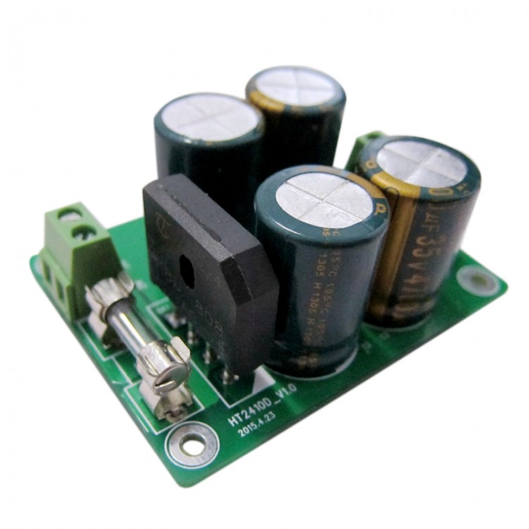 Input single channel AC input, single DC output. Within the input voltage 20V, bridge current is 800V8A, peak is 20A. The board input is with the 6.3A fuse, prevent the output short circuit board burning, dual output, can be connected to two power amplifier board. The maximum of the rectifying plate can only connect to loaded ones that is within 250W.