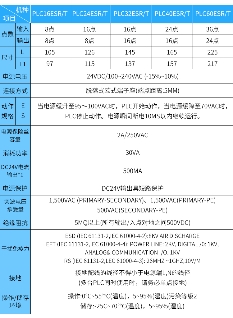 Working specifications | When the power supply rises slowly to 95-100VAC, the PLC starts to act. When the power supply drops to 70VAC, the PLC stops. The power supply will continue to operate within 10MS of an instantaneous power failure. | ||||