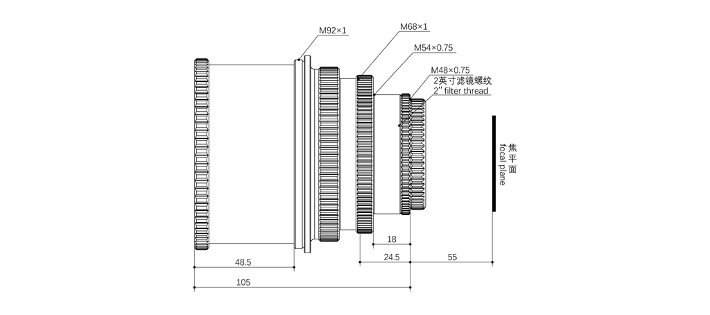 - The 0.8x reducer adopts a quadruplet design and supports a 44mm full-frame image circle. The back focus from the M48 thread is a standard 55mm. The front thread is M92x1. At the camera end, it is equipped with M68x1, M54x0.75, and M48x0.75 three sizes of adapters, which are convenient for connection. At the same time, it has a built-in M48x0.75 2-inch filter thread, which can be directly installed and used. The overall CNC machined, both end threaded metal caps prevent ash when not in use.