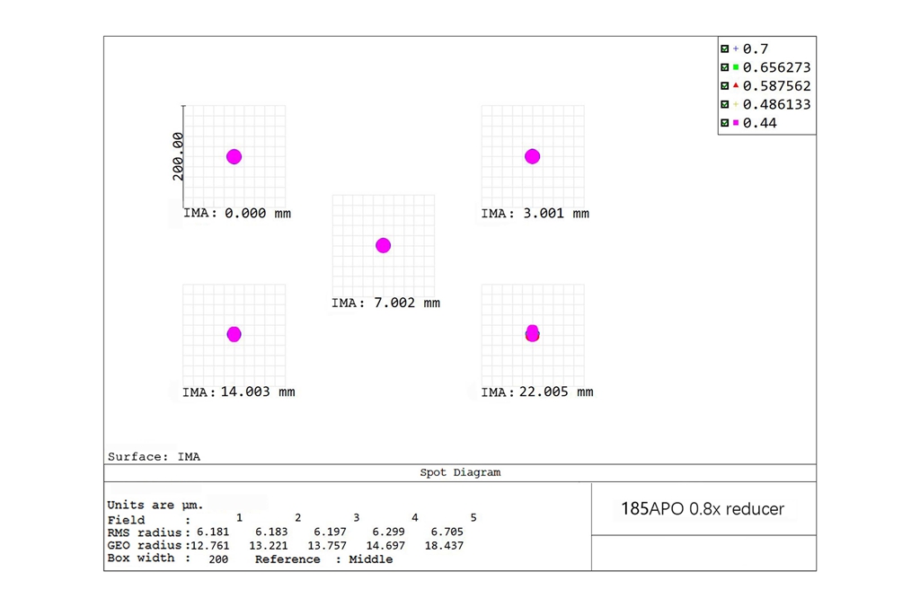 - The 0.8x reducer can bring 185APO's focal ratio down to F5.6. This is a standard reducer with field flattening capabilities as well. A shorter focal ratio allows the OTA to have a wider field of view and faster exposure times, making it suitable for shooting large areas of nebulae, star clusters, and faint, fast-moving celestial objects.