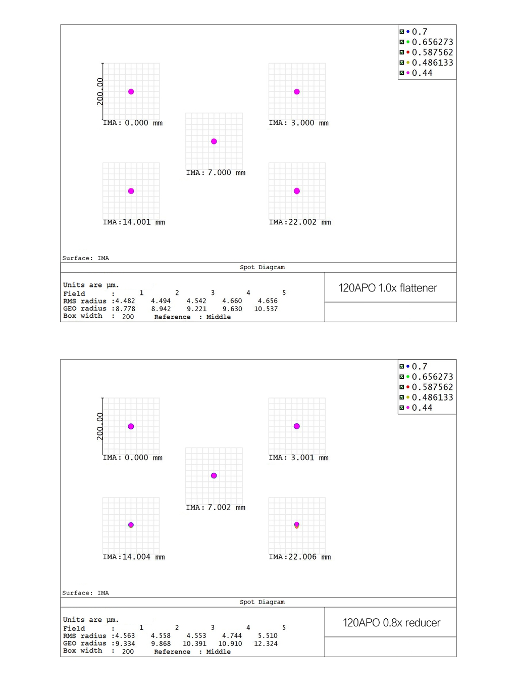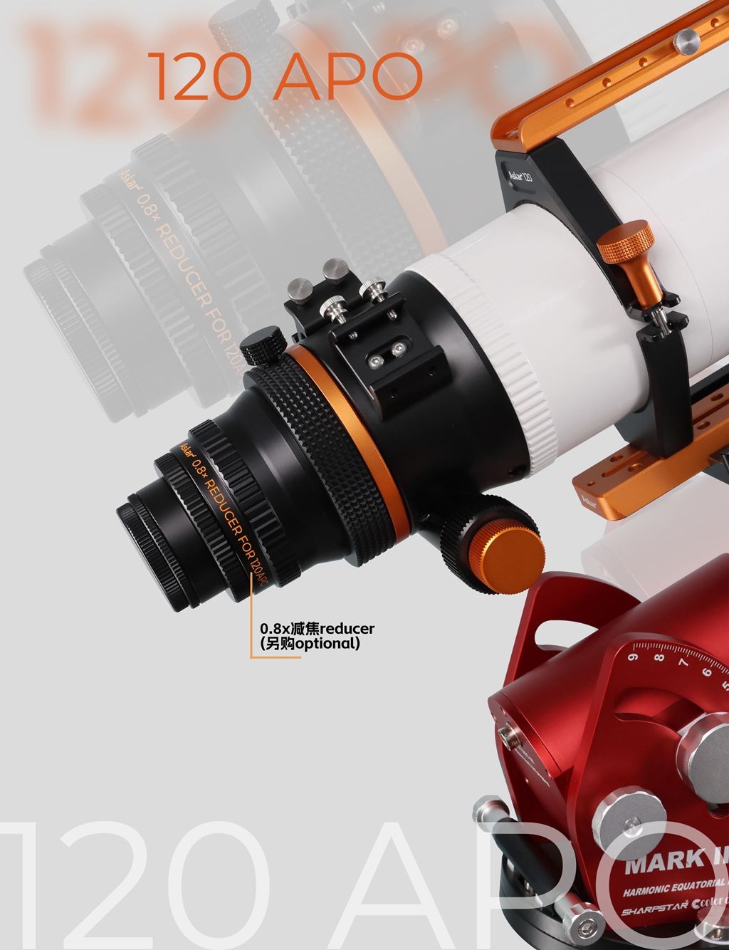 - The 0.8x reducer can bring the 120APO's focal ratio down to f/5.6. This is a standard reducer with field flattening capabilities as well. A shorter focal ratio allows the OTA to have a wider field of view and faster exposure times, making it suitable for shooting large areas of nebulae, star clusters, and faint, fast-moving celestial objects.