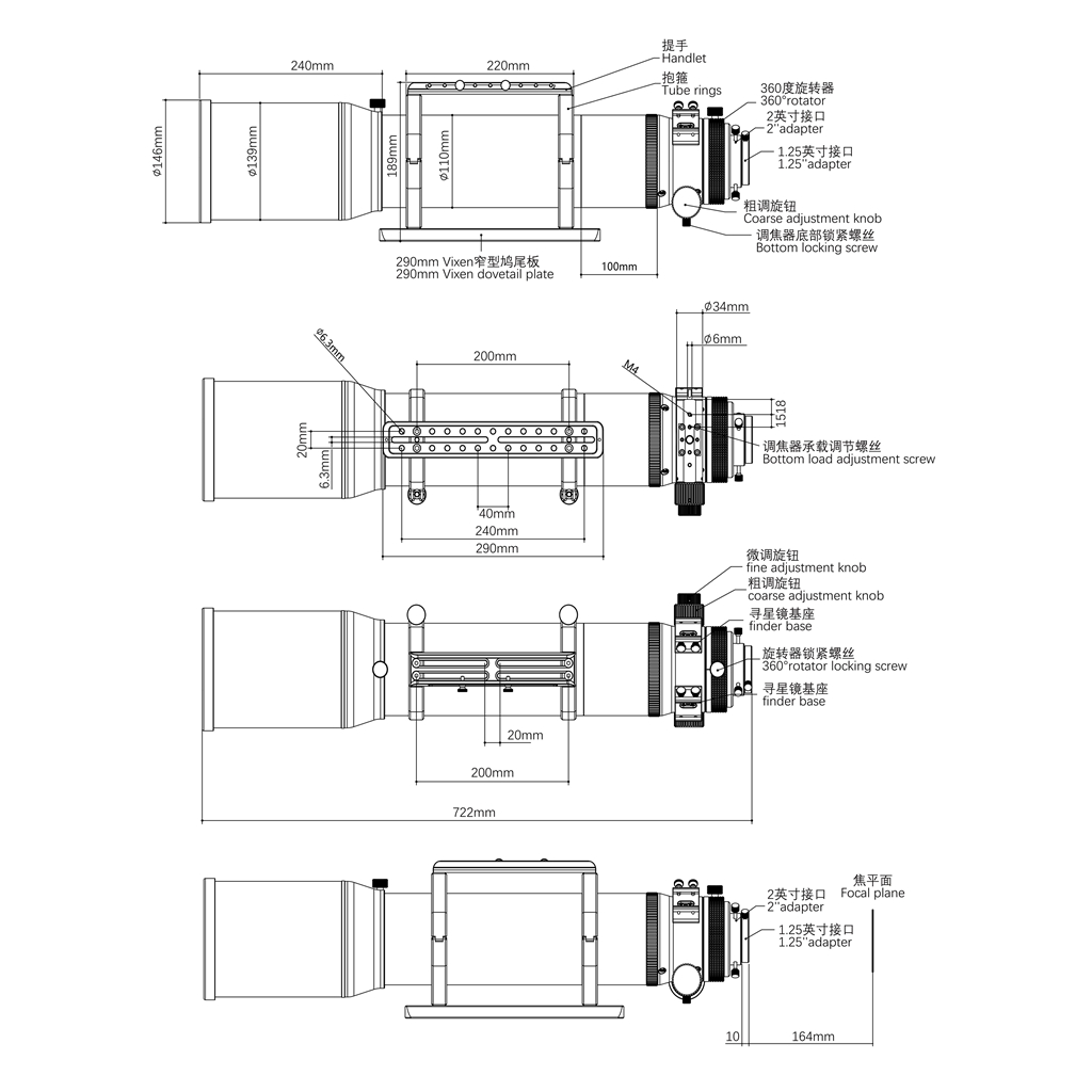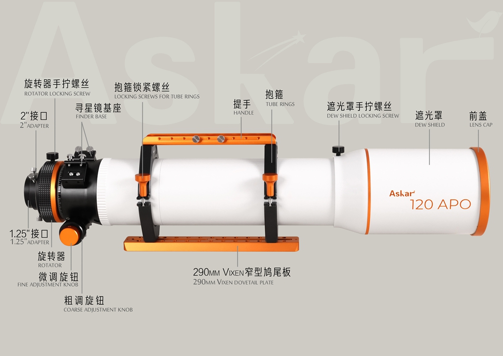 - The handle of the 120APO has a special slot design, making it also a base for installing a finder scope. The handle itself has been extended by 60mm, which makes the tube rings more convenient to fix the astrograph.