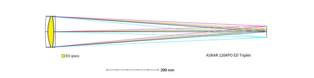 - 120APO adopts a triplet air-spaced APO lens design, including one piece of ED glass.