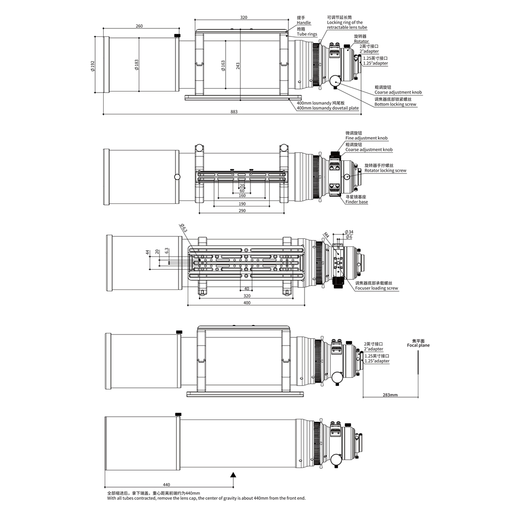 - Total length: 883mm (when the dew shield is contracted); 996mm (when the dew shield is stretched)