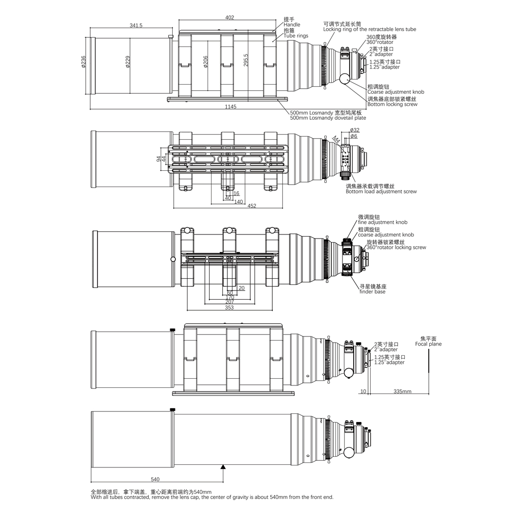 - Total length: 1145mm (when the dew shield is contracted); 1335mm(when the dew shield is stretched)