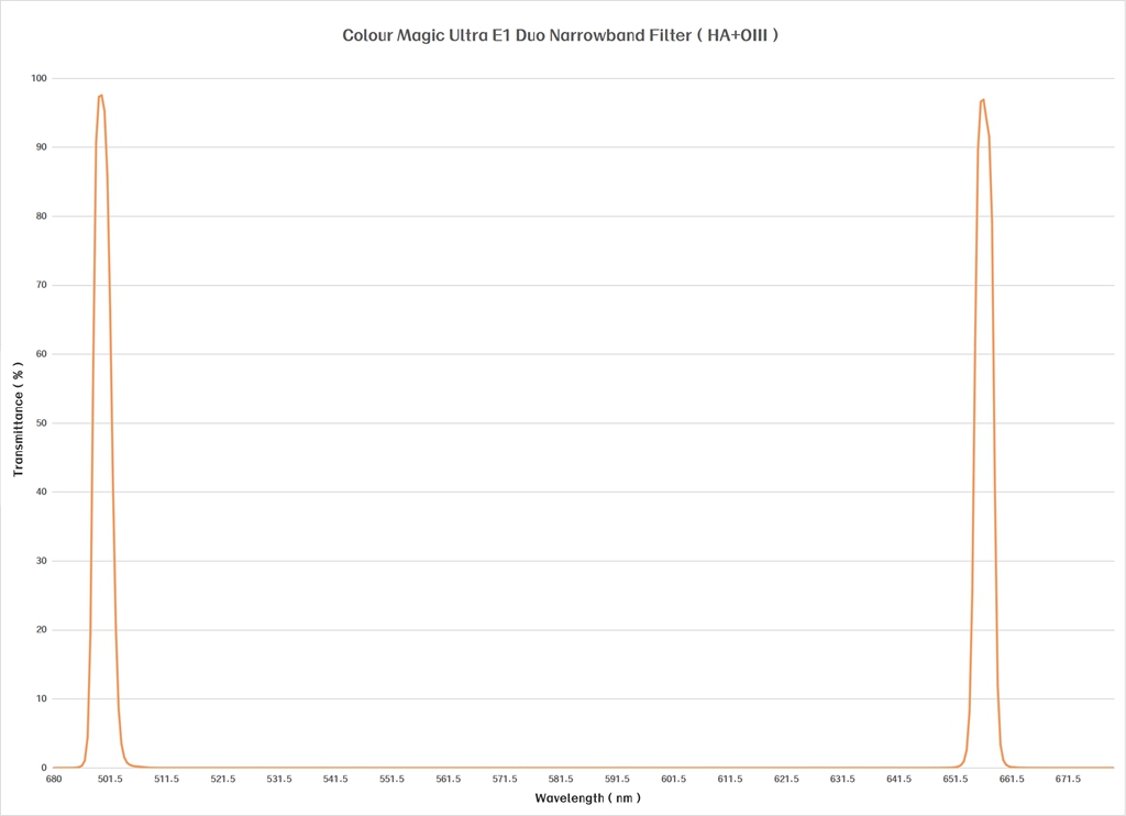 - Ultra E1 duo-band filter has an extremely narrow bandwidth, and an ultra-high transmittance over 85% at its center wavelength (500.7nm and 656.6nm). It can effectively eliminate the influence of light pollution. Even if you are in an area seriously affected by light pollution, the pictures taken with the ColourMagic Ultra E 2” Duo-narrowband Filter are still very good. It is so practical and efficient that you can get astronomical images of high quality with just one duo-band filter and an ordinary astronomical colour camera.