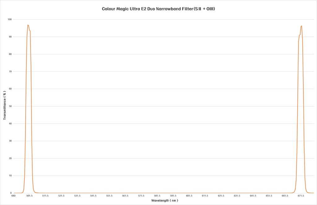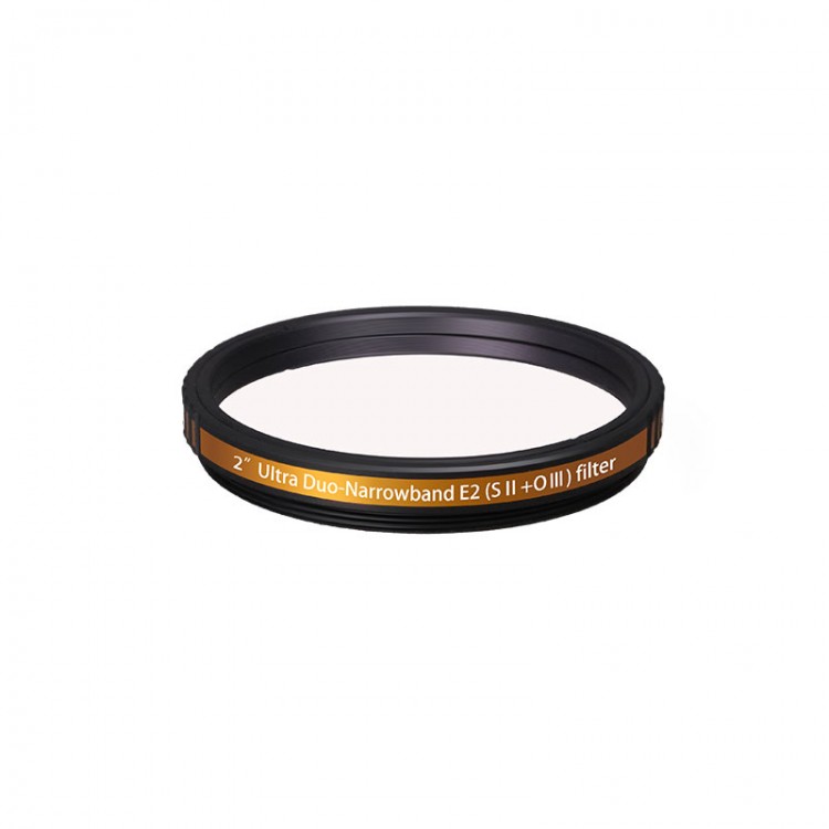 - E2 Duo-narrowband filter (OIII+SII) has an ultra-high transmittance of over 85% at its center wavelength (500.7nm and 672nm). It can effectively enhance the contrast of your pictures, making it easier to display the details of the stars that otherwise are fairly difficult to spot. In areas with very serious light pollution, this filter can also selectively filter light pollution and cluttered signals through the emission lights of the nebula to achieve the ideal shooting effect.