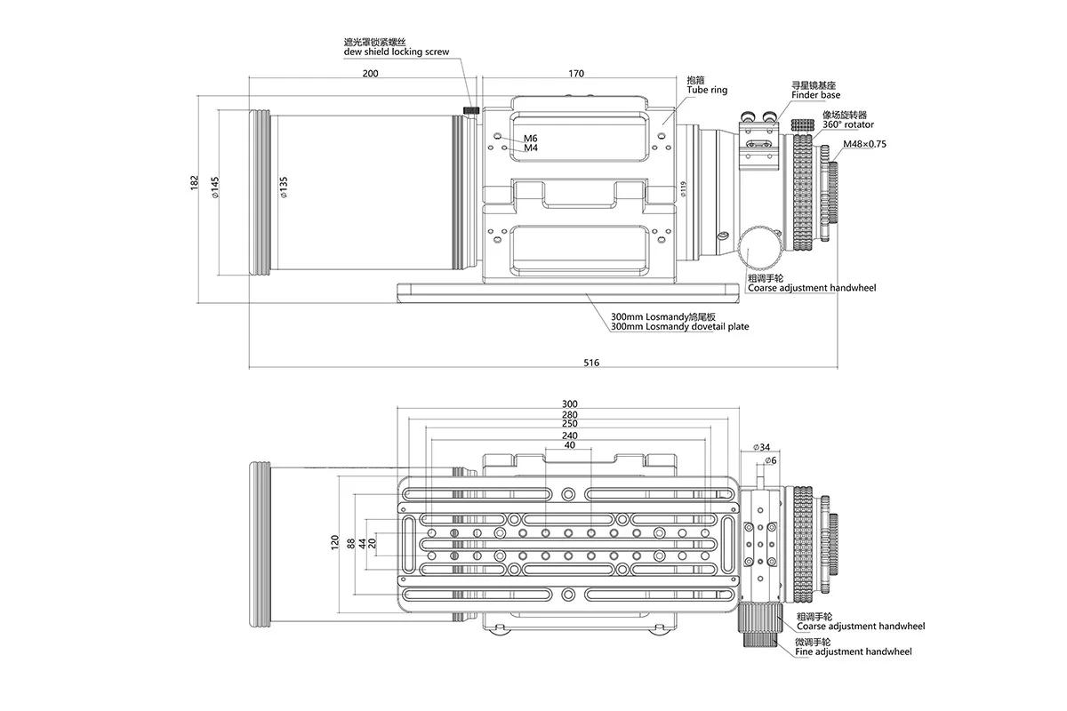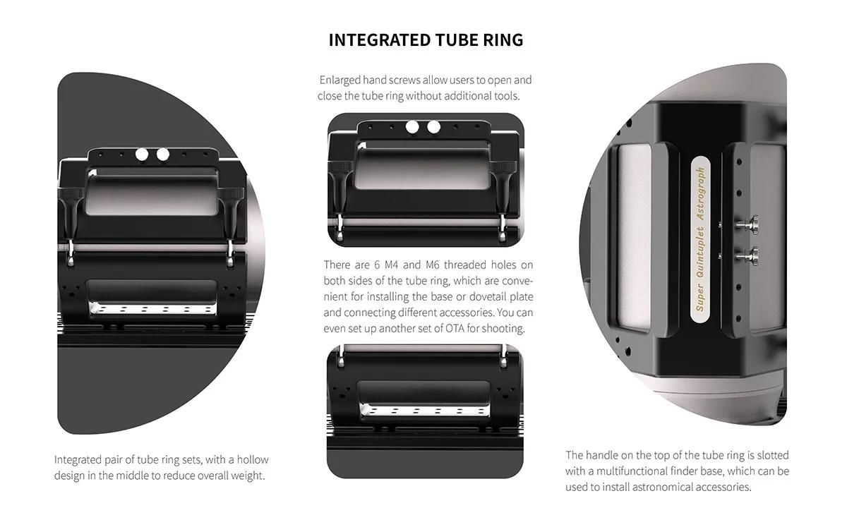 - The clamp of SQA106 is an integrated double clamp with a hollow center to reduce the overall weight. There are 6 M4 and M6 threaded holes designed on both sides of the clamp, which are convenient for installing the base or dovetail plate and connecting various accessories. The top handle of the hoop is equipped with a multifunctional star seeking mirror base groove, which can be used to install various astronomical accessories. The bottom dovetail of the clamp is a standard Losmandy type 300mm dovetail.