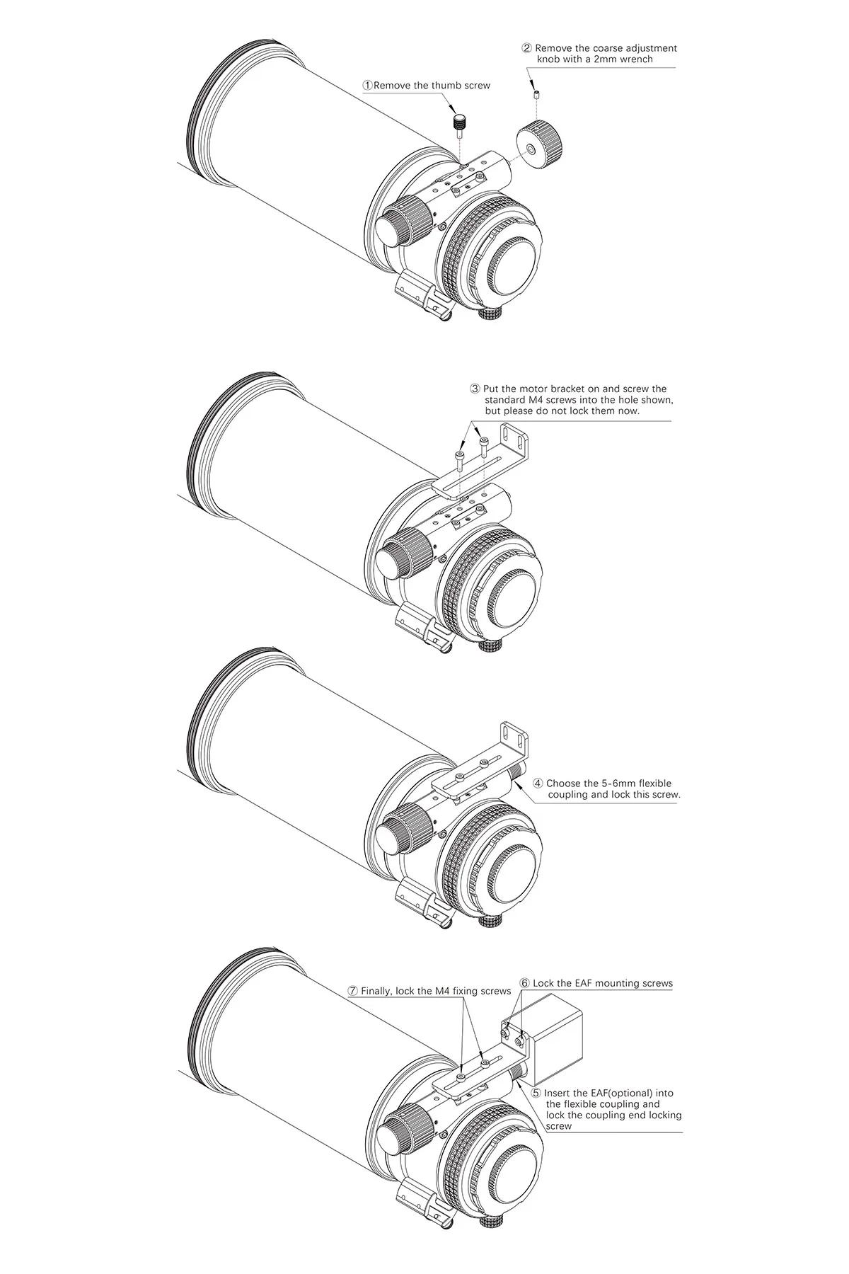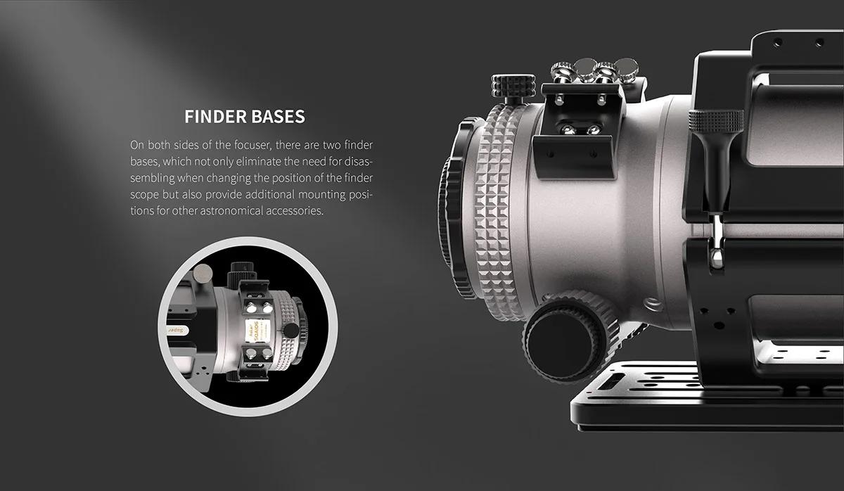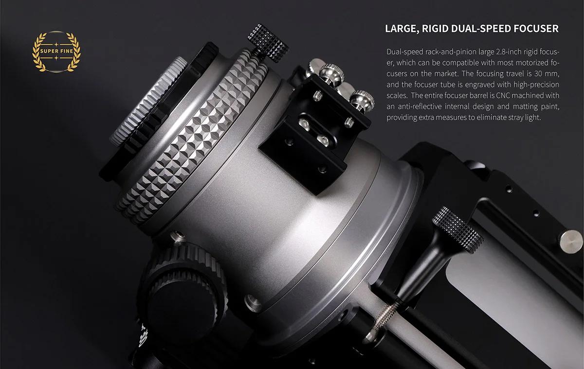 - The SQA106 focusing device is a dual speed gear rack type large 2.8-inch high rigidity focuser, compatible with the vast majority of electric focusers on the market. The focusing stroke is 30mm, and the focusing cylinder is engraved with high-precision scales. Each side of the focuser is equipped with a seeker base, which not only allows for easy replacement of the seeker position without disassembly, but also provides more space for installing other astronomical accessories.