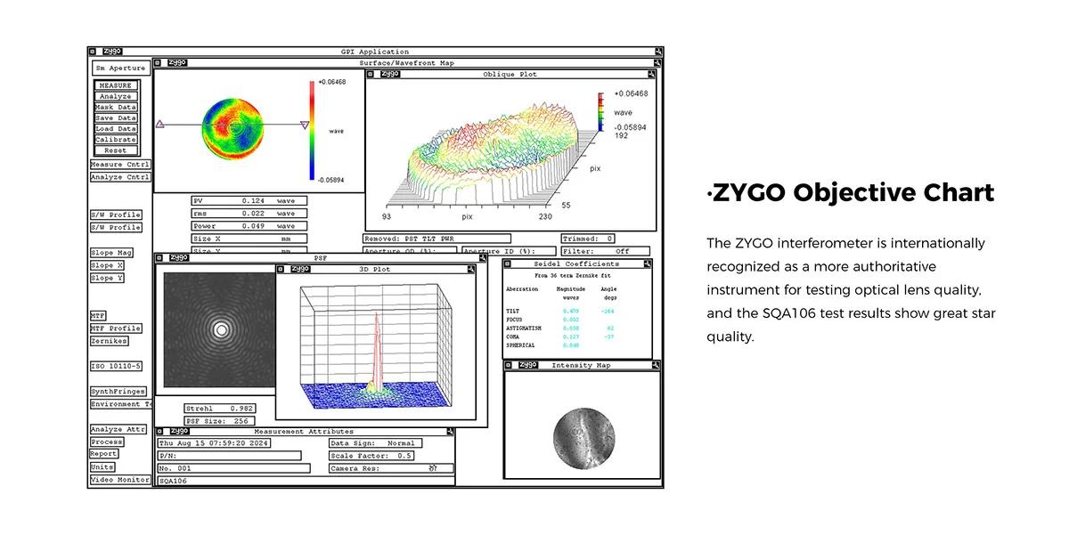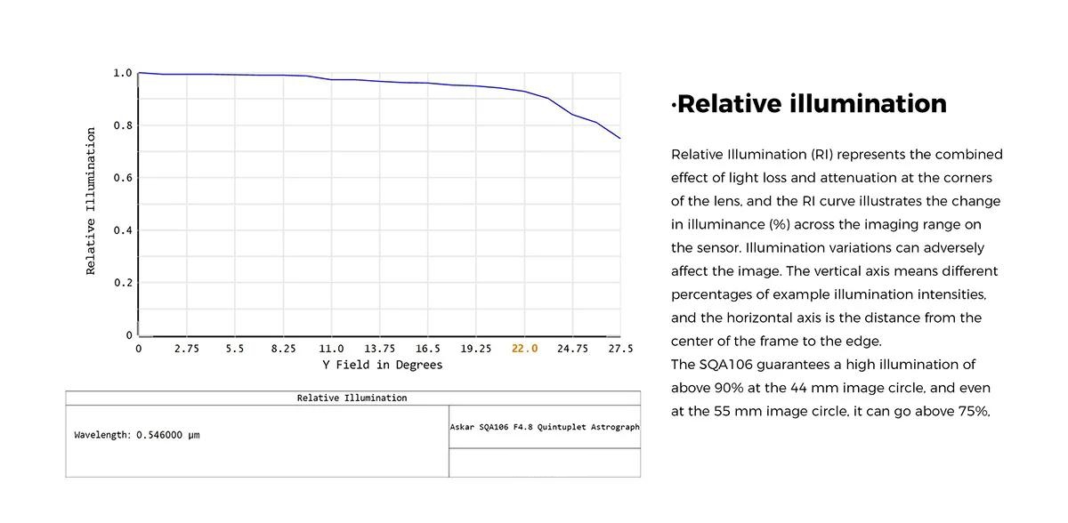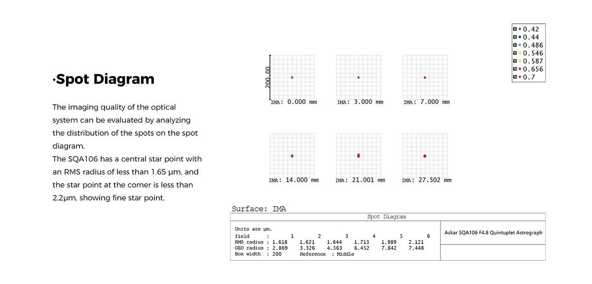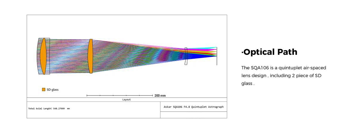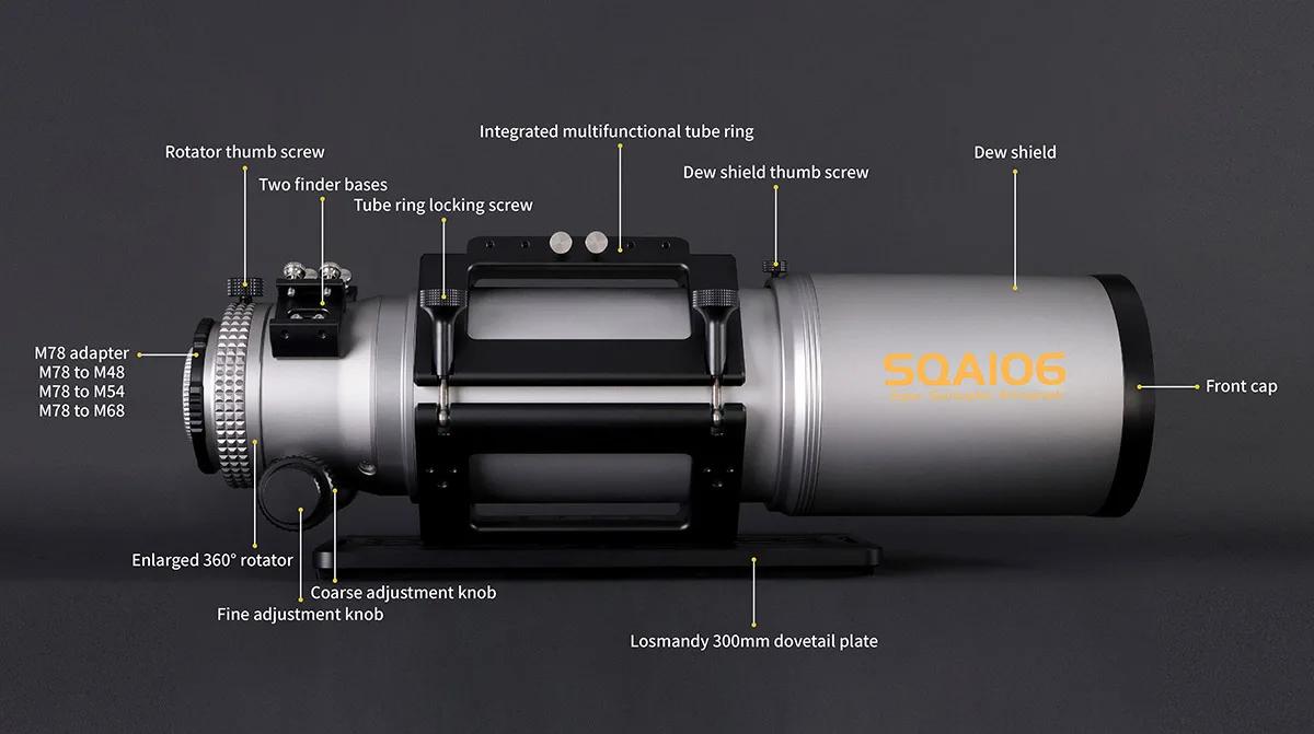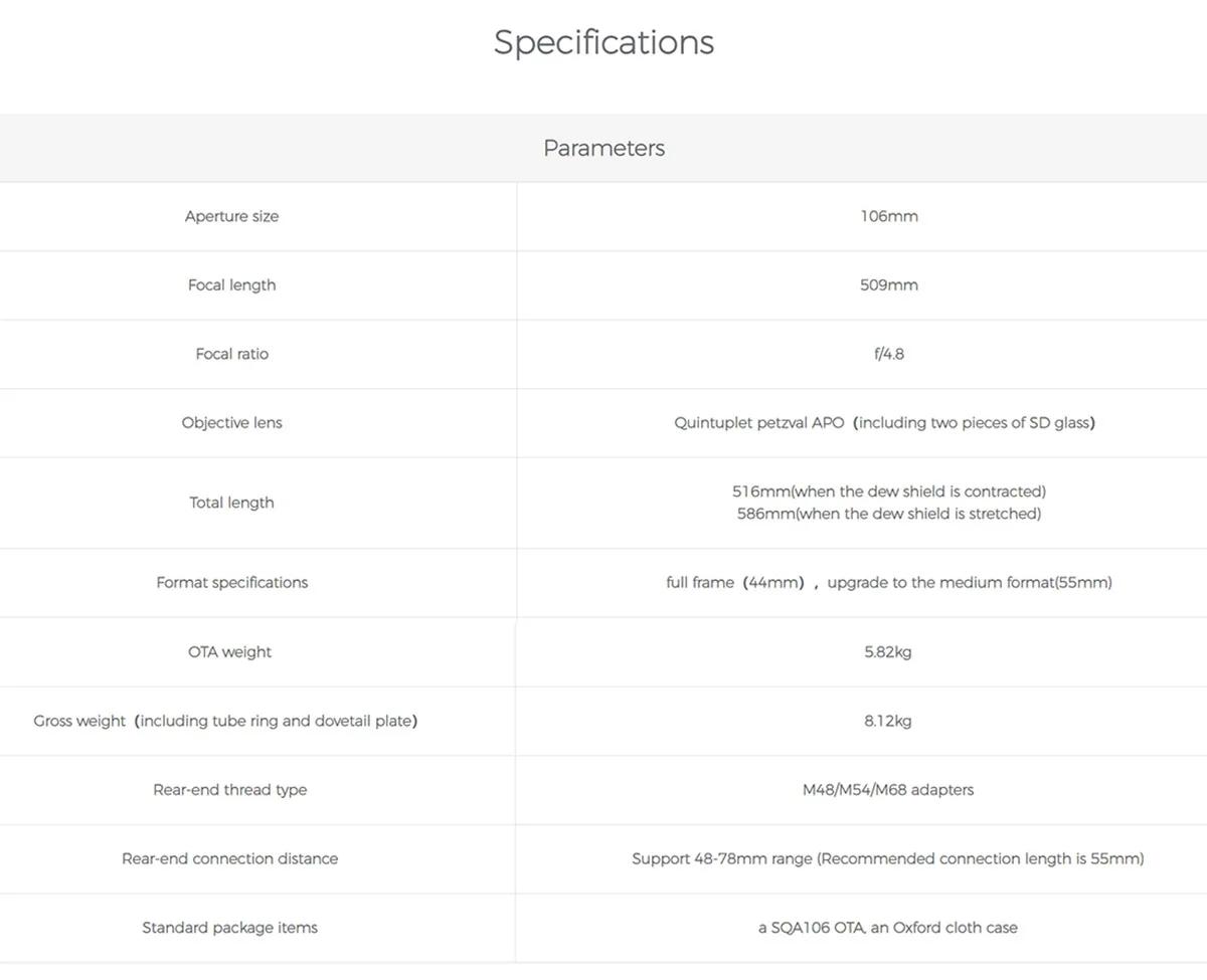 - SQA106 is a celestial telescope with a diameter of 106mm, a focal length of 509mm, and a native focal ratio of F4.8. The SQA106 star point performs exceptionally well, with excellent full field illumination and MTF performance.
