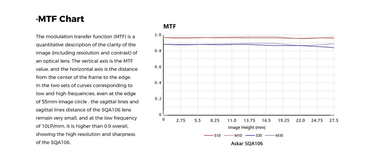 - SQA106 is a five piece fully separated design, including 2 pieces of SD glass and supporting a 55mm imaging circle.