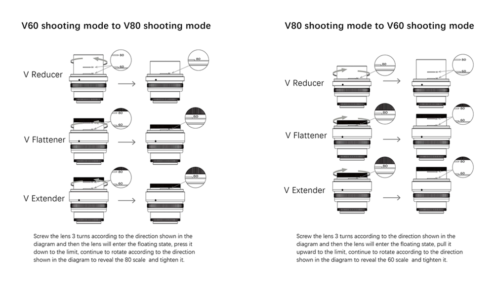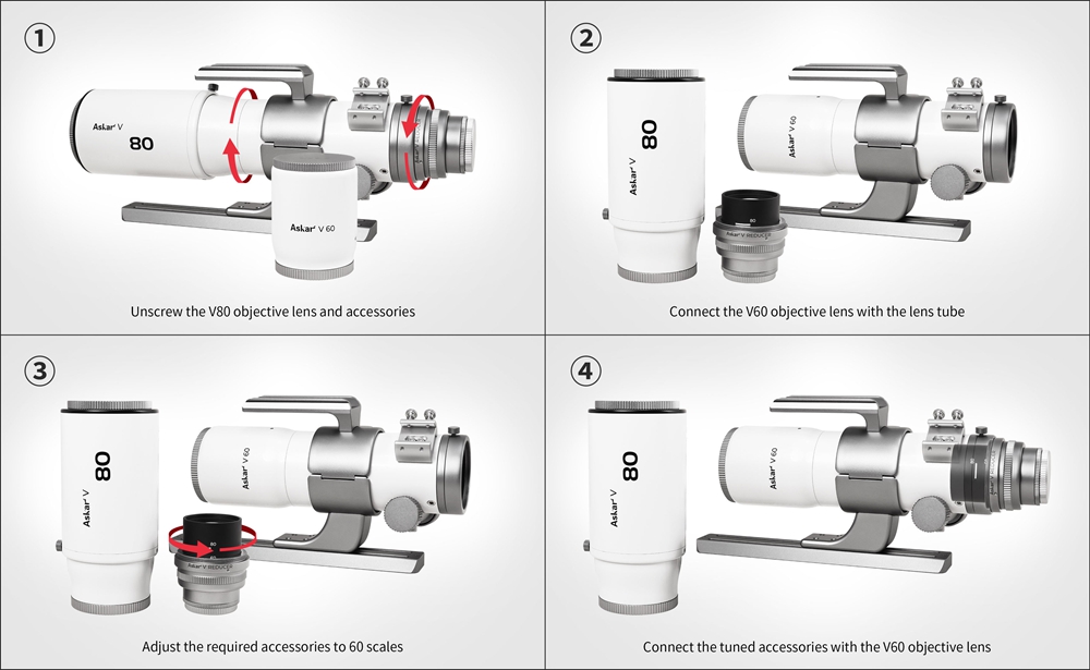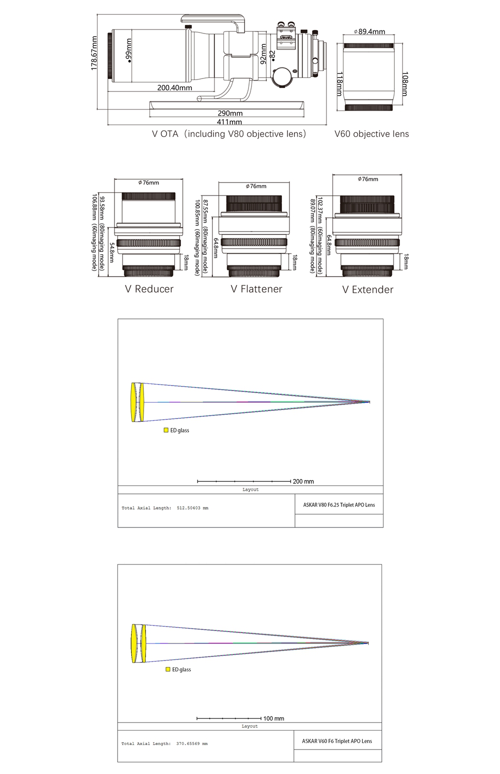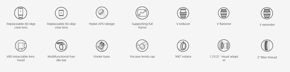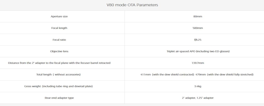 - The V60 objective lens and V80 objective lens, both adopt a triplet APO design, two of which are ED glass, which can effectively eliminate chromatic aberration and increase image clarity. The V60 native focal ratio is f/6, and the focal length is 360mm. The V80 native focal ratio is f/6.25, and the focal length is 500mm. V is equipped with three additional accessories that are adjustable to 60mm or 80mm scales through rotation. The rear end of each accessory has M48 and M54 adapters with 2" built-in filter thread and the back focus is a standard 55mm.