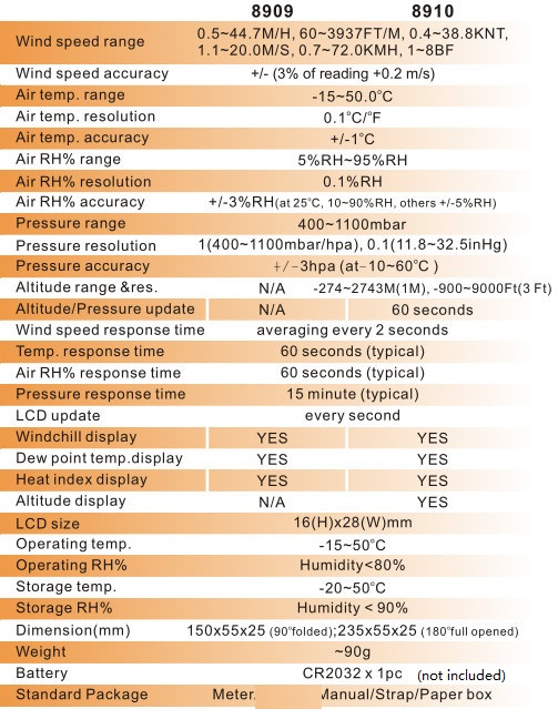 - Measures air velocity ,temperature, humidity, windchill temerature, dew point temperature, barometric pressure,heat index and altitude.