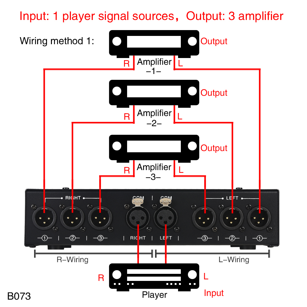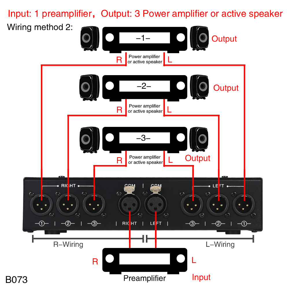 - 1 set of balanced signal input, 3 sets of balanced signal output.
