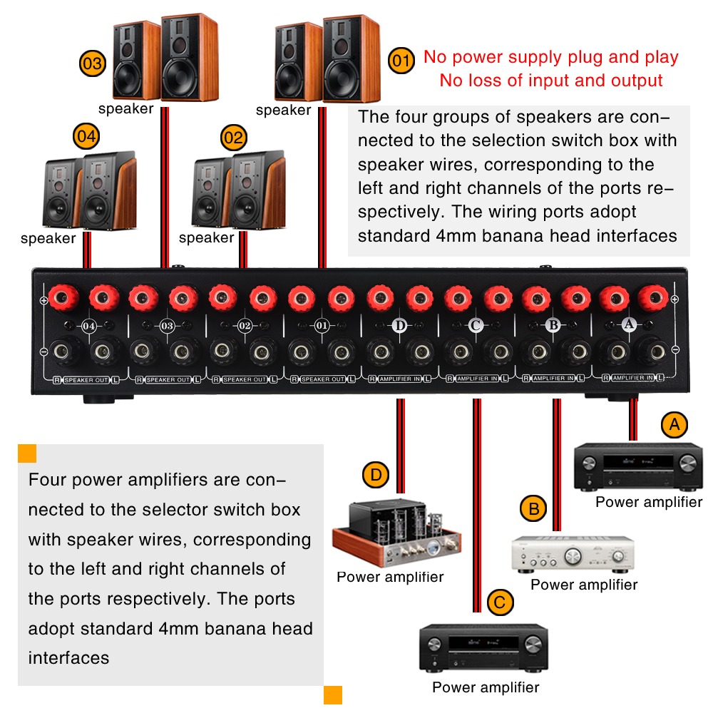 - Connect the power amplifier to the A-B-C-D positions of the amplifier.