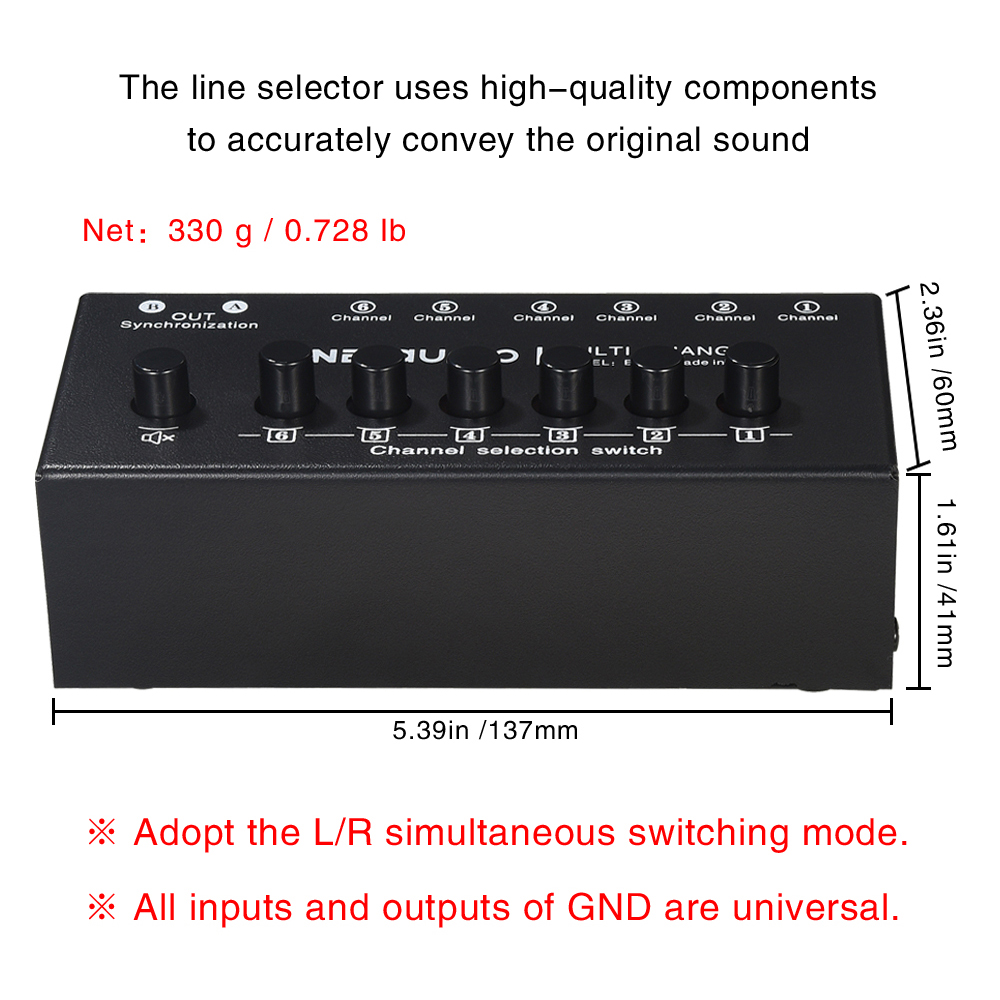 - The 6-channel input adopts high-contact reliability self-locking key switches for switching. When one key is pressed, the other switch will automatically pop up to disconnect the circuit.