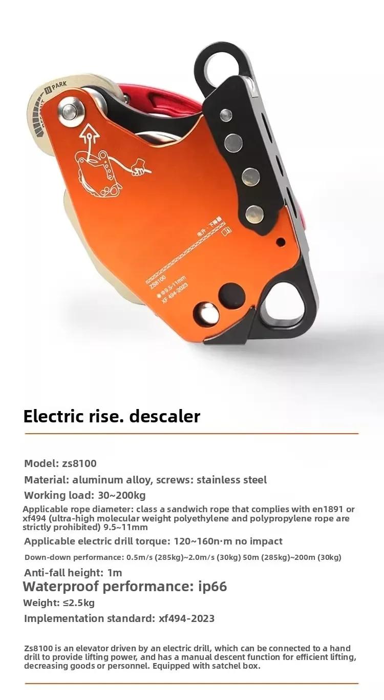 - ZS8100 is an electric drill driven ascender that can be connected to a handheld electric drill to provide lifting power, and has a manual descent function for efficient lifting and lowering of goods or personnel. Equipped with a suitcase.
