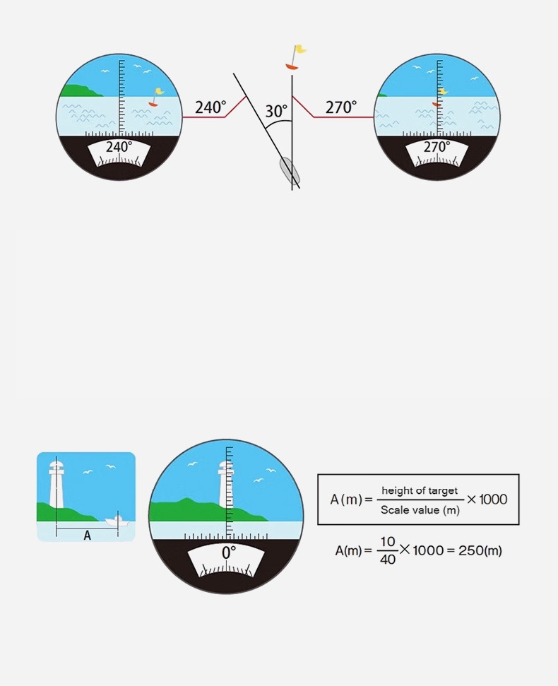 - Measure size and distance: As long as you know either the size of the target object or the distance from the target, you can roughly determine the size and distance. The height of the lighthouse is 10M, and the scale points to 40M. Simply apply these two simple formulas to determine the approximate distance.