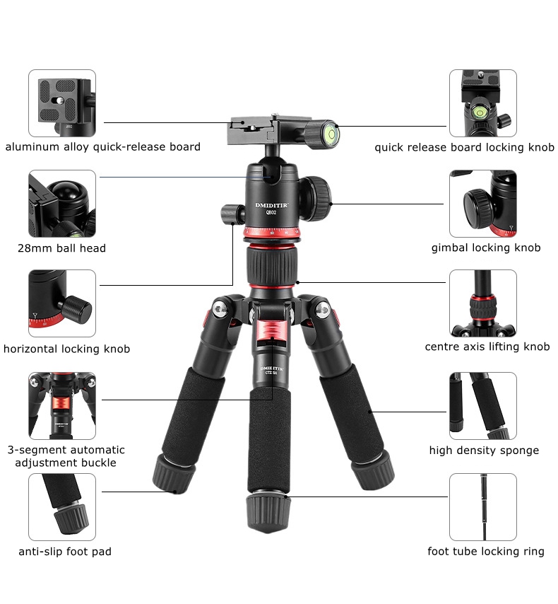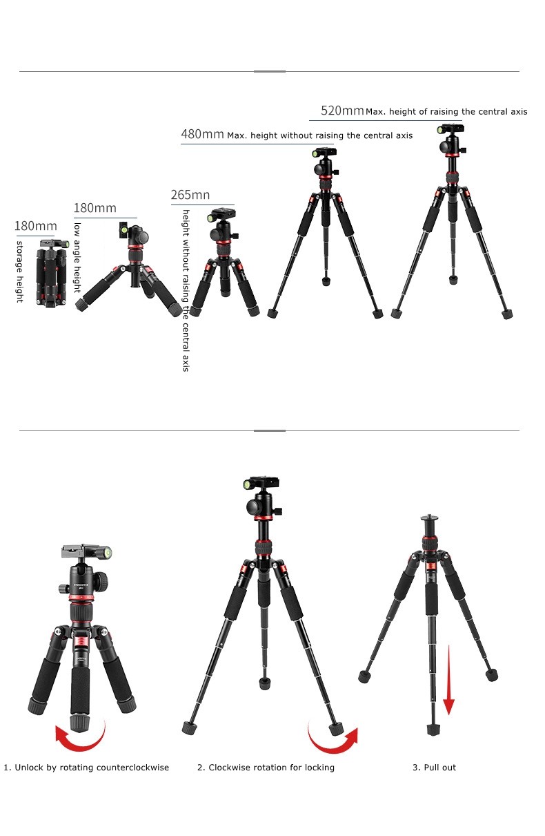 - Telescopic foot tube: freely adjustable, lightweight and portable. The 5-section foot tube design allows you to flexibly adjust the height of the tripod according to the shooting scene and needs, and this design makes it easier to carry.