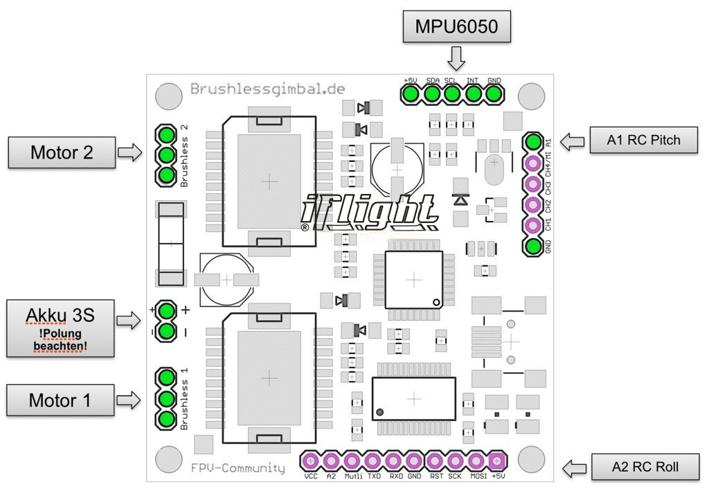 - This control board can connect transmitter and control pitch and roll,and it is can connect roll and pitch of flight controller.