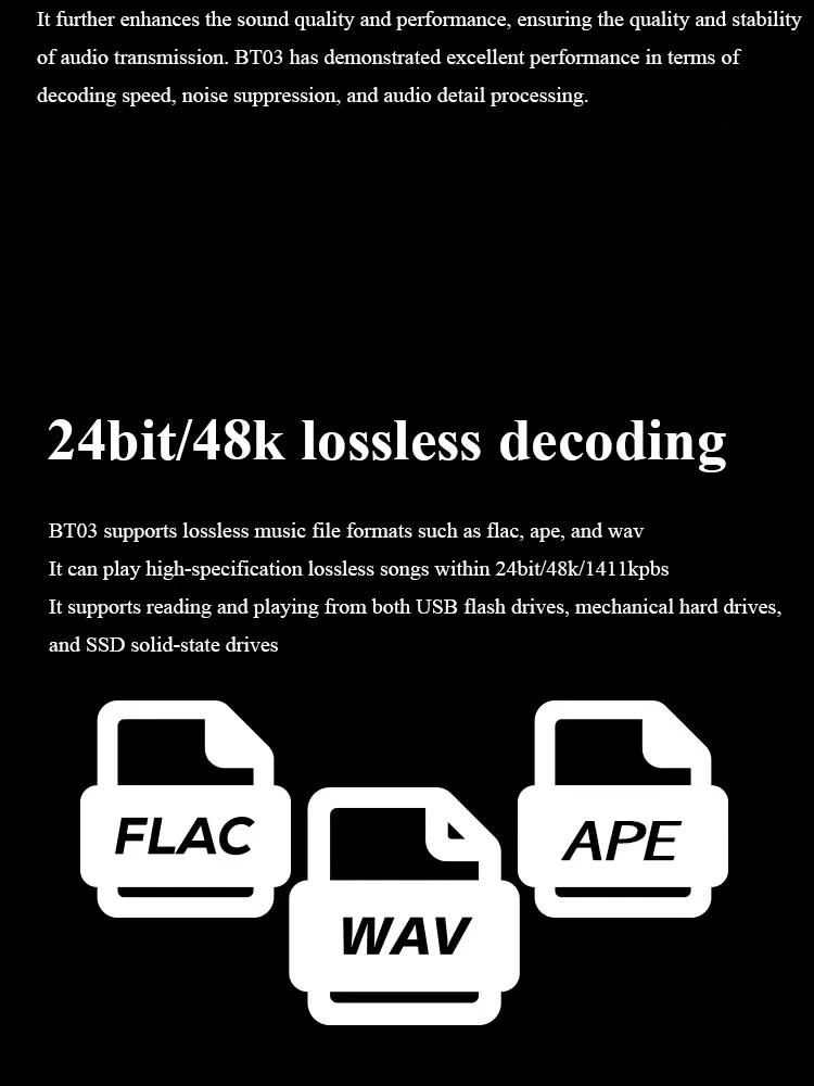 - Lossless format support: FLAC/APE/WAV within 24bit/48k/1411kbps