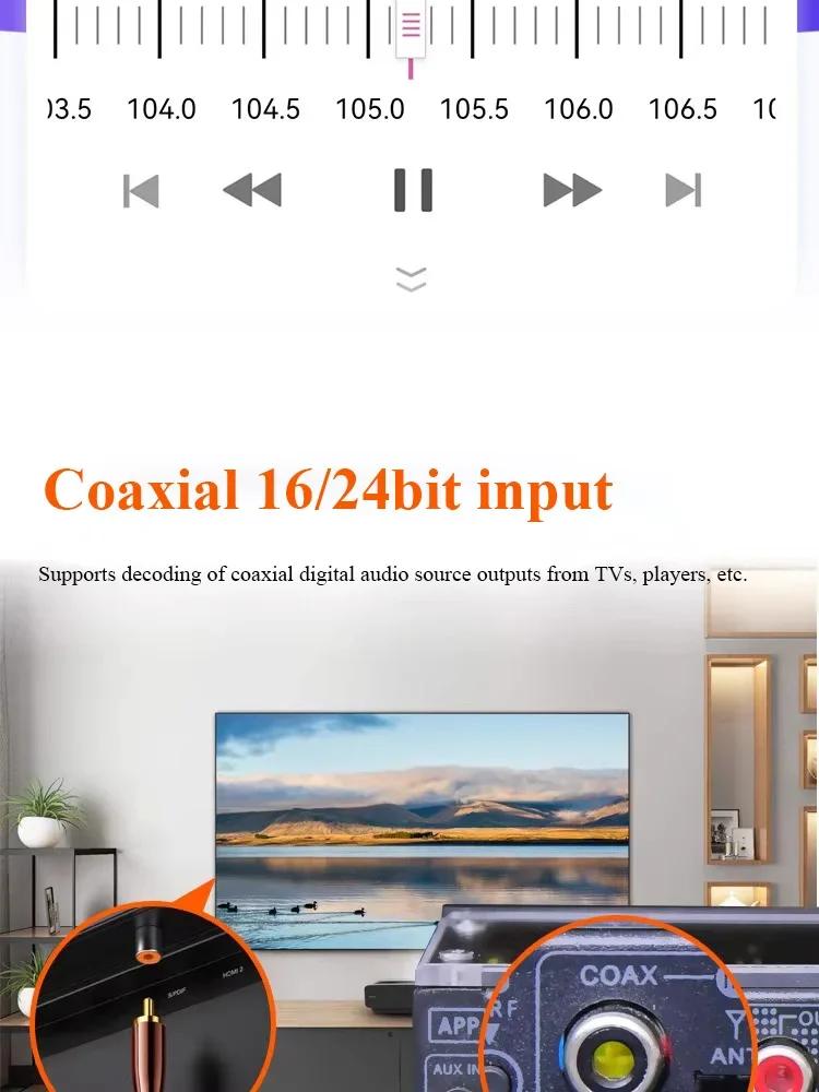- Supported modes: Bluetooth/USB playback/FM radio, coaxial input/analog audio input