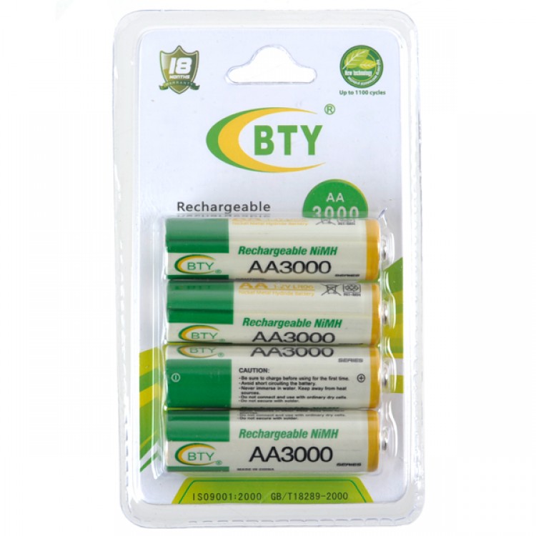 • BTY Rechargeable 1.2V 3000mAh Ni-MH AA Battery 4-Packs