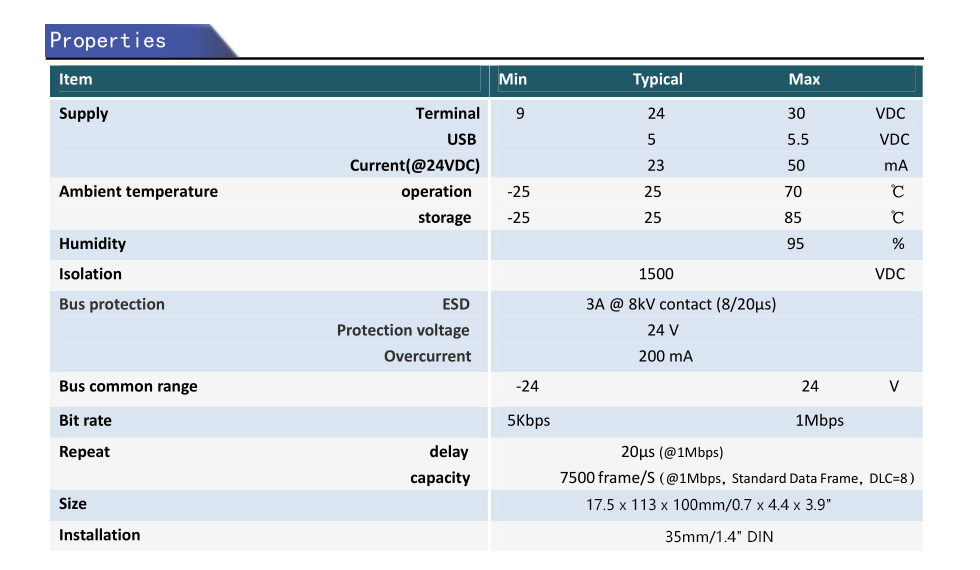 * 110 nodes bus load capacity, compatible with 24V CAN system