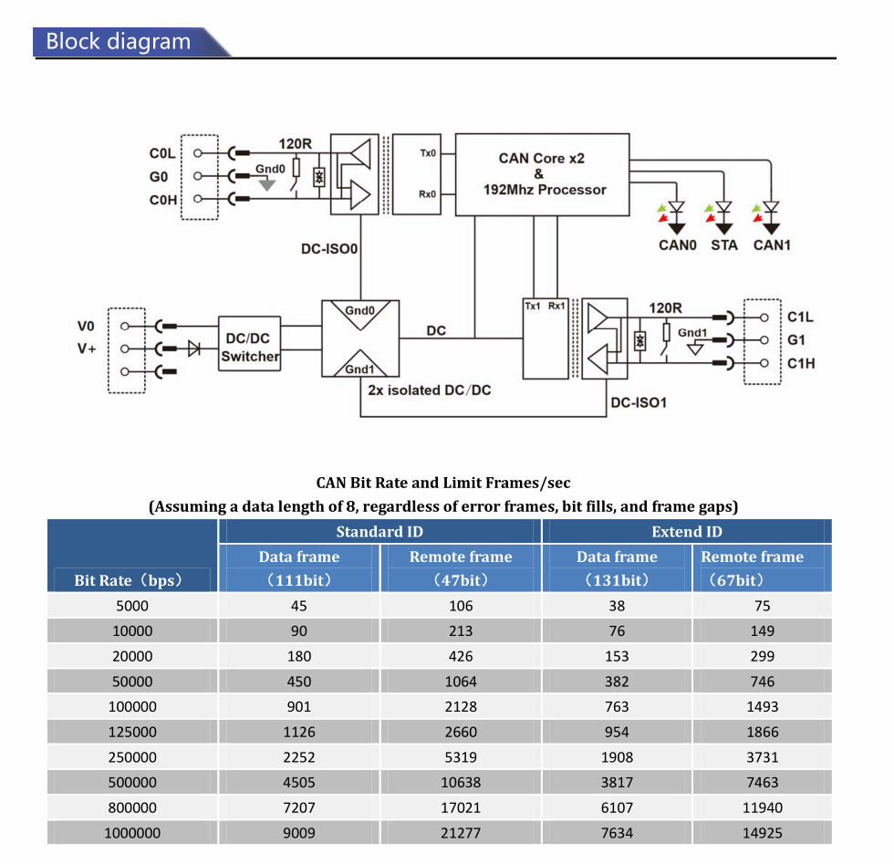 * CAN2.0A/B standard, 5K-1Mbps bit rate configurable setting