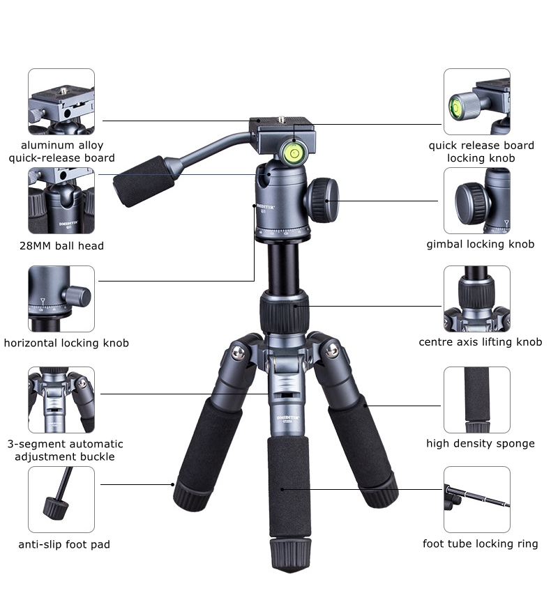 - Telescopic foot tube: freely adjustable, lightweight and portable. The 5-section foot tube design allows you to flexibly adjust the height of the tripod according to the shooting scene and needs, and this design makes it easier to carry.