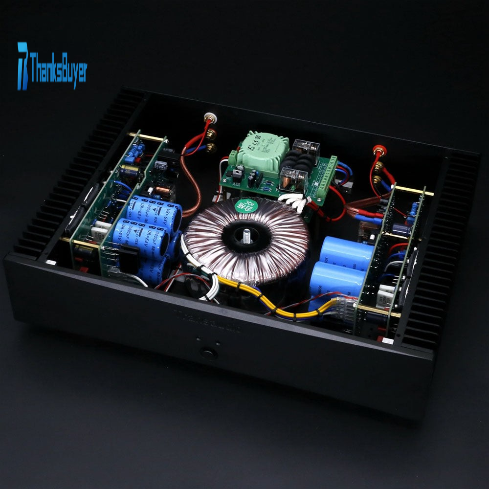 * Fully independent left and right channel design, with separate amplification boards, power supply boards, and protection boards for each channel