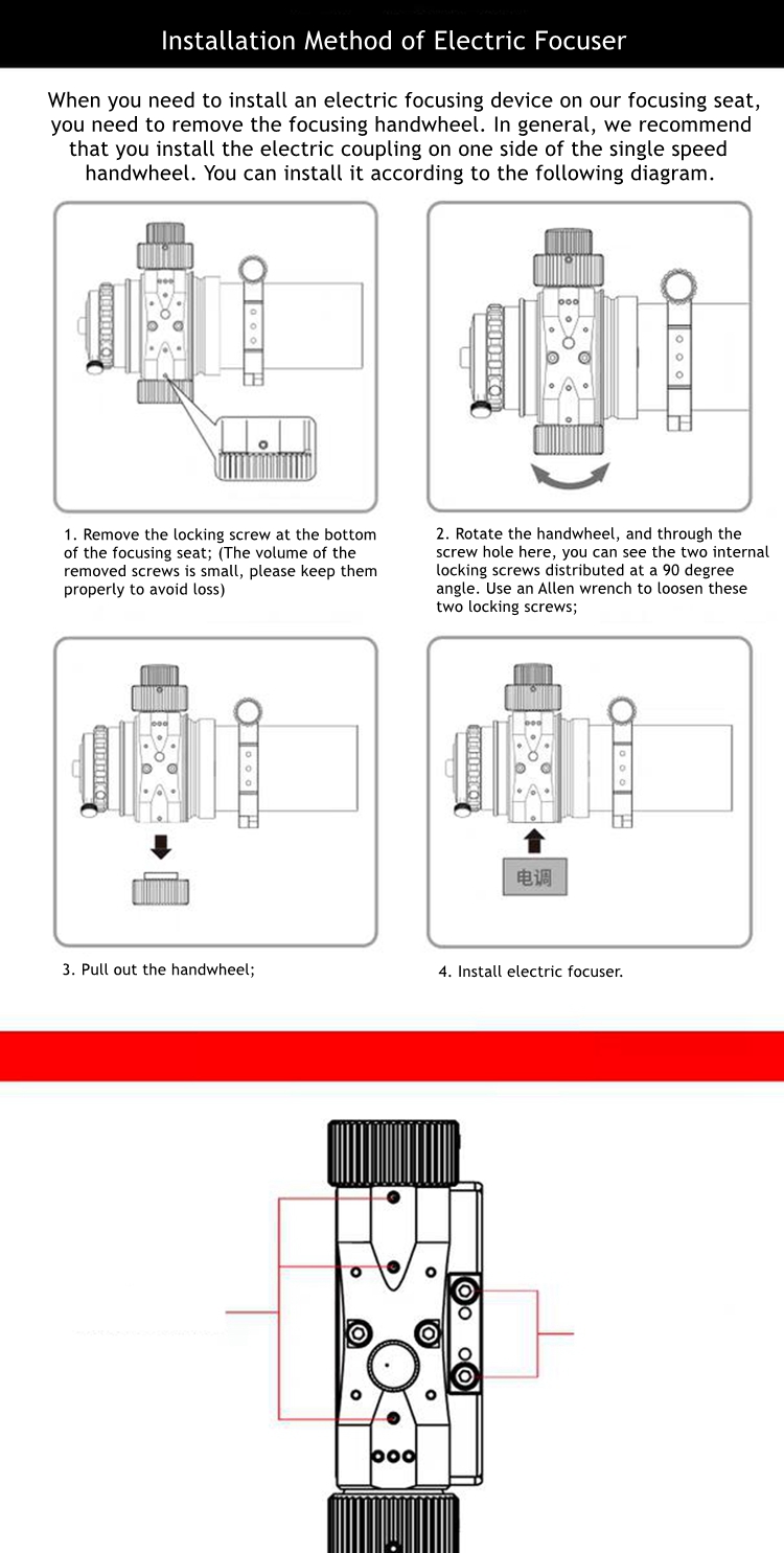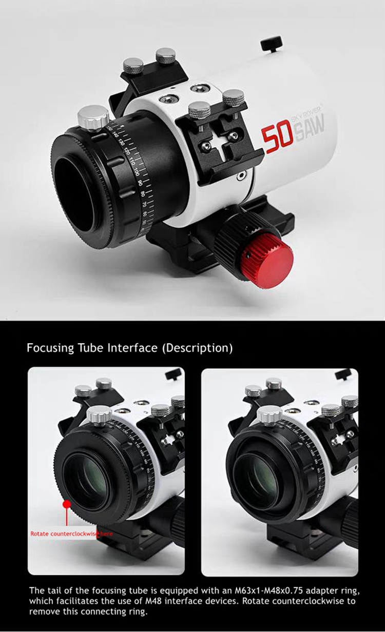 - 2.5-inch aluminum alloy dual speed focuser, CNC machining, integrated cutting of lens tube, sturdy and reliable. The effective stroke is 26mm, and the end is integrated with an image field rotator for easy composition.