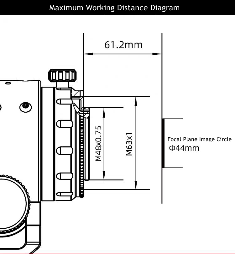 - The original flat field design has an image circle of 44 millimeters, and when paired with a camera, there is no need to adjust the back intercept, just focus. The front M72x1 thread can accommodate most standard 72mm aperture photography filters.