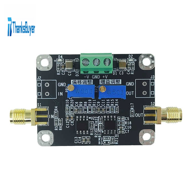 The module is an amplifier with adjustable bias. It can independently adjust the DC offset and amplification of the signal. The module supports a wide voltage supply of up to ±18V, with input and output voltages reaching ±13V, and a unity gain bandwidth of up to 2MHz. Under a ±15V power supply, the bias adjustment range is ±11V. Therefore, it can be widely used in signal conditioning (signal bias adjustment, uni-polar to bipolar or bipolar to uni-polar conversion), ADC/DAC input buffers, and signal amplification applications. Additionally, the module provides signal input and output interfaces with terminal connectors, offering flexibility for customer applications.
