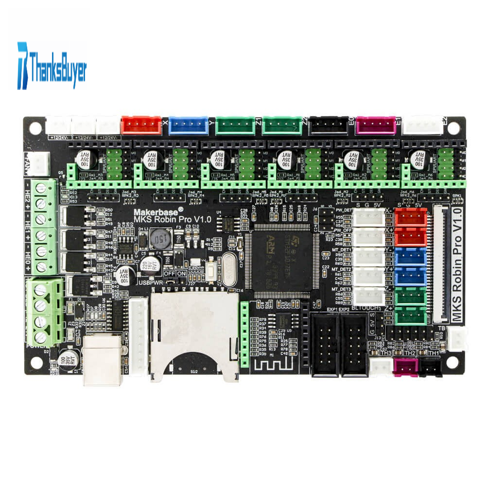 MKS ROBIN PRO is a multi-axis printing 3D control board, equipped with STM32F103 main chip, 72MHZ frequency. The motherboard supports 6-axis motor output and can support three-head printing. The hardware supports double Z, plug and play. It also supports motherboard firmware developed by MKS and Marlin2.0 firmware. With multiple screen solutions, it is compatible with LCD12864 and MINI12864, also supports robin TFT touch screens of multiple sizes. It can support external and direct plug-in methods, and the direct plug-in drive is compatible with various drive special modes (uart, spi, etc.)