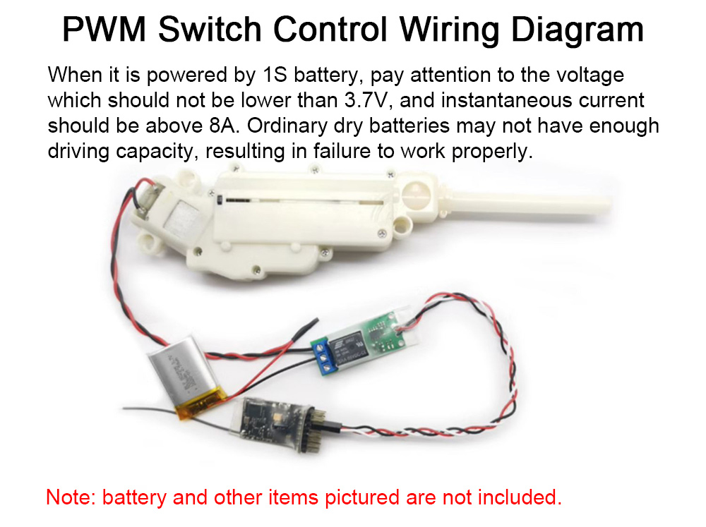 Insert the signal input cable into an idle receiver channel that corresponds to a switch on the remote controller. When it is connected to a receiver, the power indicator will light up. When the switch channel is turned on, the working indicator will light up. When the switch channel is turned off, the working indicator will turn off.