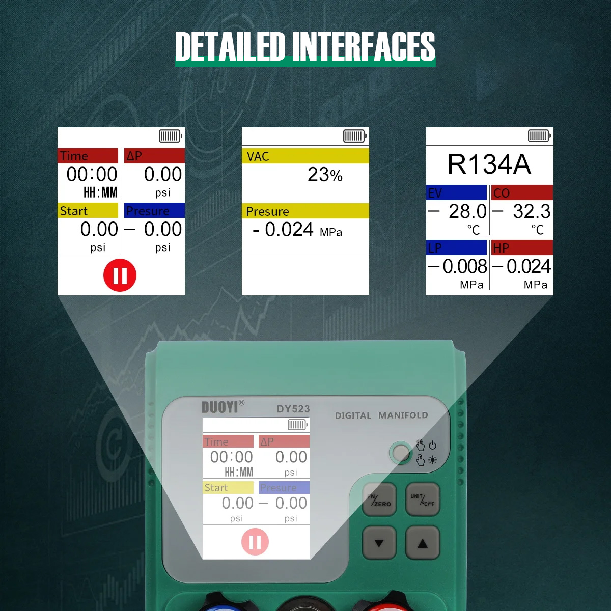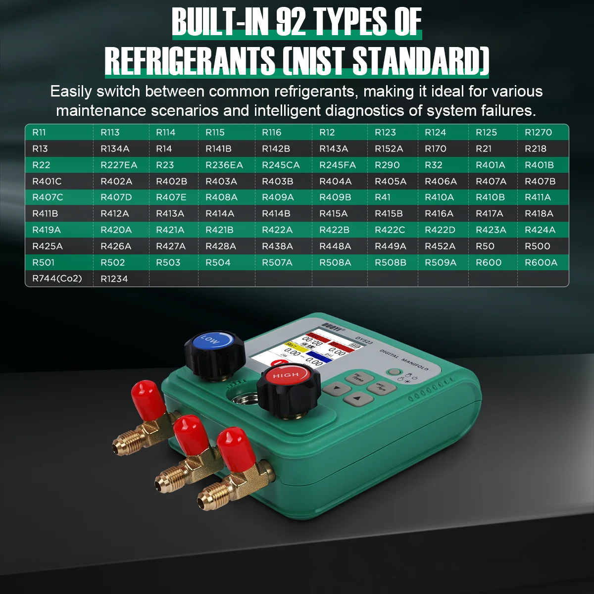 * Easily switch between common refrigerants, making it ideal for various maintenance scenarios and intelligent diagnostics of system failures.