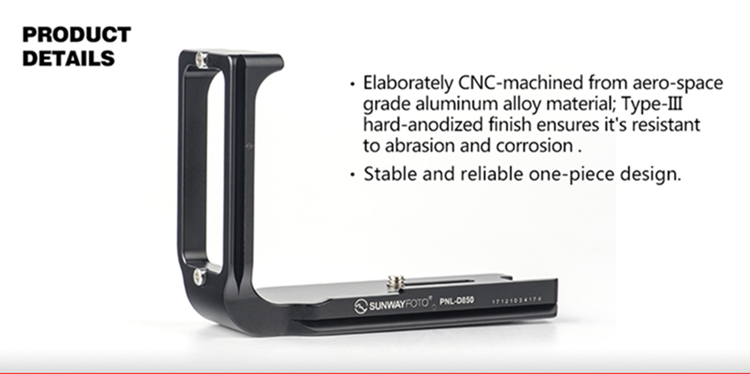 PNL-D850 custom L bracket for Nikon D850, one piece CNC cutting machined from light weight aircraft-grade aluminum, stain anodized surface finish for better abrasion and corrosion resistant.