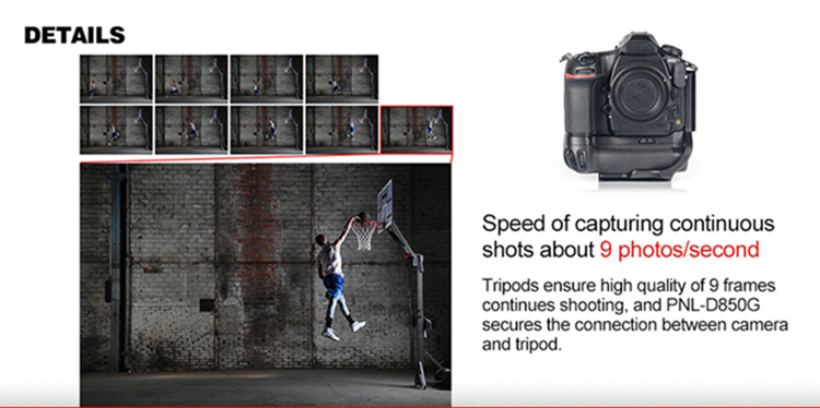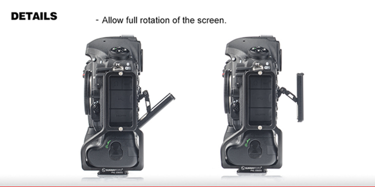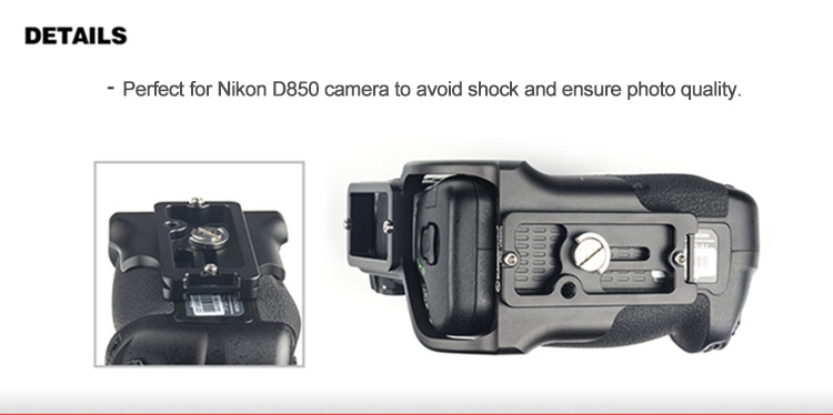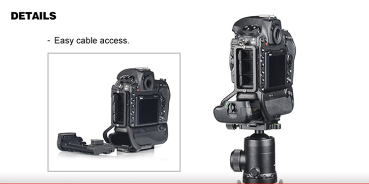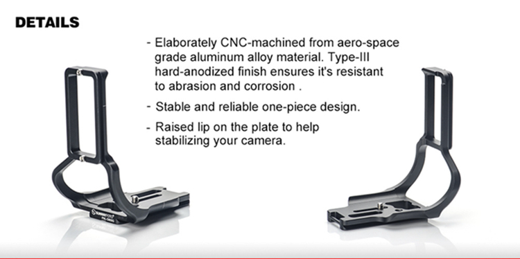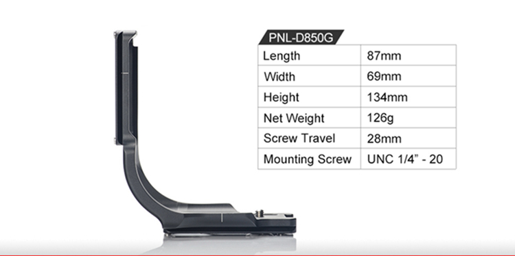 PNL-D850G Dedicated L-bracket with battery grip for Nikon D850, adopt CNC cutting machined from light weight aircraft-grade aluminum, stain anodized surface finish for better abrasion and corrosion resistant.